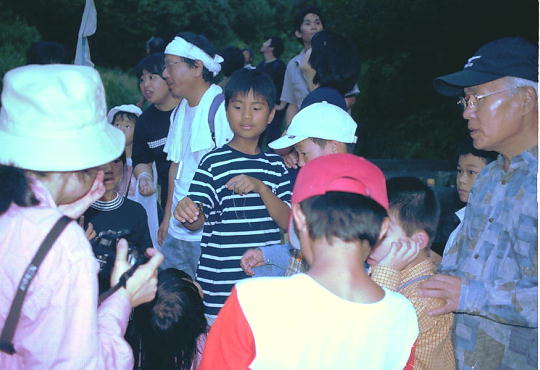 ![]() | 内 容: 宣伝が早かったのとリビング紙に松田さんの写真入りのコメントが出たせいか、問い合わせと申し込みが相次ぎ、例年になく泉北外からの参加が多かった。 今年は松田さんの提案で早目に集合して、まず、どんぐり広場で参加者の方々にトンボ釣りの”歴史”の紹介と、「ブリ」の作り方、使い方の説明と実技が行 われた。糸の両サイドに小石を油紙(謄写版)でくるんで作るブリも、ブリをスイングさせて放物線を描くように投げ上げるのも小学生には難しかったが、中に はカンの良い子もいてそこそこに技術を習得。コナラの道を抜け20分ほど歩いて第二豊田川沿いの”会場”にくる。 バラッと雨もきたが、トンボ釣りには支障はない。と言っても風があるせいか蚊など小さな虫が少なく、そのせいか餌をとりに山から下りたヤンマの姿も少な い。碧色の複眼が美しいマルタンヤンマも時折姿をみせるが、ブリにはかからない。ちょっと待ちくたぴれてぐずる幼児もいる。その間、網で採ったヤブヤンマ やネアカヨシヤンマ、コシボソヤンマなどを観察する。翅を力強くふるわせ、あごを大きくあけて噛みつくヤンマに子どもたちは魅せられている。 たそがれが山合いに忍んできて、そろそろお開きかと思う頃、ついに名人・松田勲さんがヤブヤンマを1頭、ゲット。歓声が湧く。 トンボ釣りの釣果は、松田さんのヤブヤンマ♂と参加者の道野さんが最初に釣ったトンボの仲間のコヤマトンボ♂の2頭だった。子どもたちは岡田三朗さん(関西トンボ談話会)からのお土産を手に、懐中電灯を頼りに帰路についた。 |