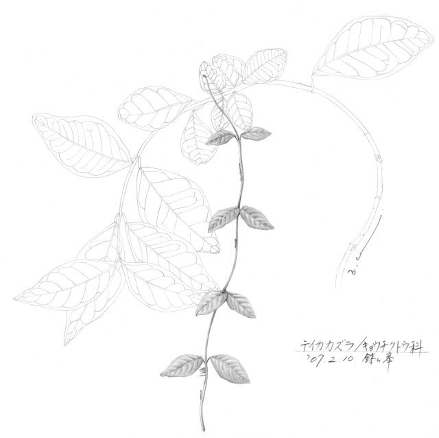 顕花植物門被子植物亜門双子葉植物綱合弁花亜綱キョウチクトウ科テイカカズラ属テイカカズラ。山野の林内に普通な常緑のつる性木本。鉢ヶ峯でも普通に見られる。